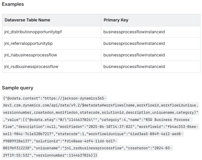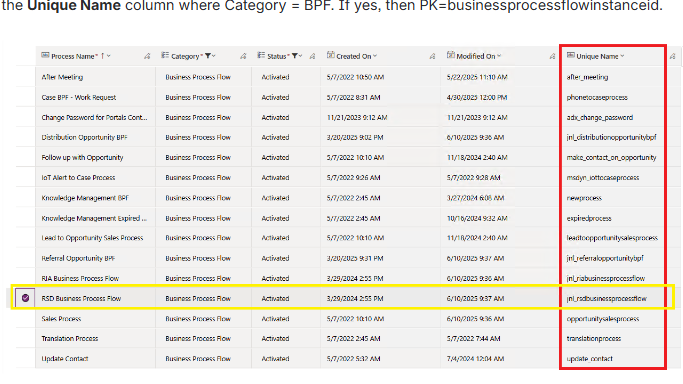 If you are trying to determine a table’s primary key and you suspect that table corresponds to a BPF, then you can confirm by using the Web API to query the Process table (schema name: workflow). With your query, you are trying to determine if that table’s schema name exists in the Process table’s Unique Name column. Your query would need to include the condition: where Category equals BPF.